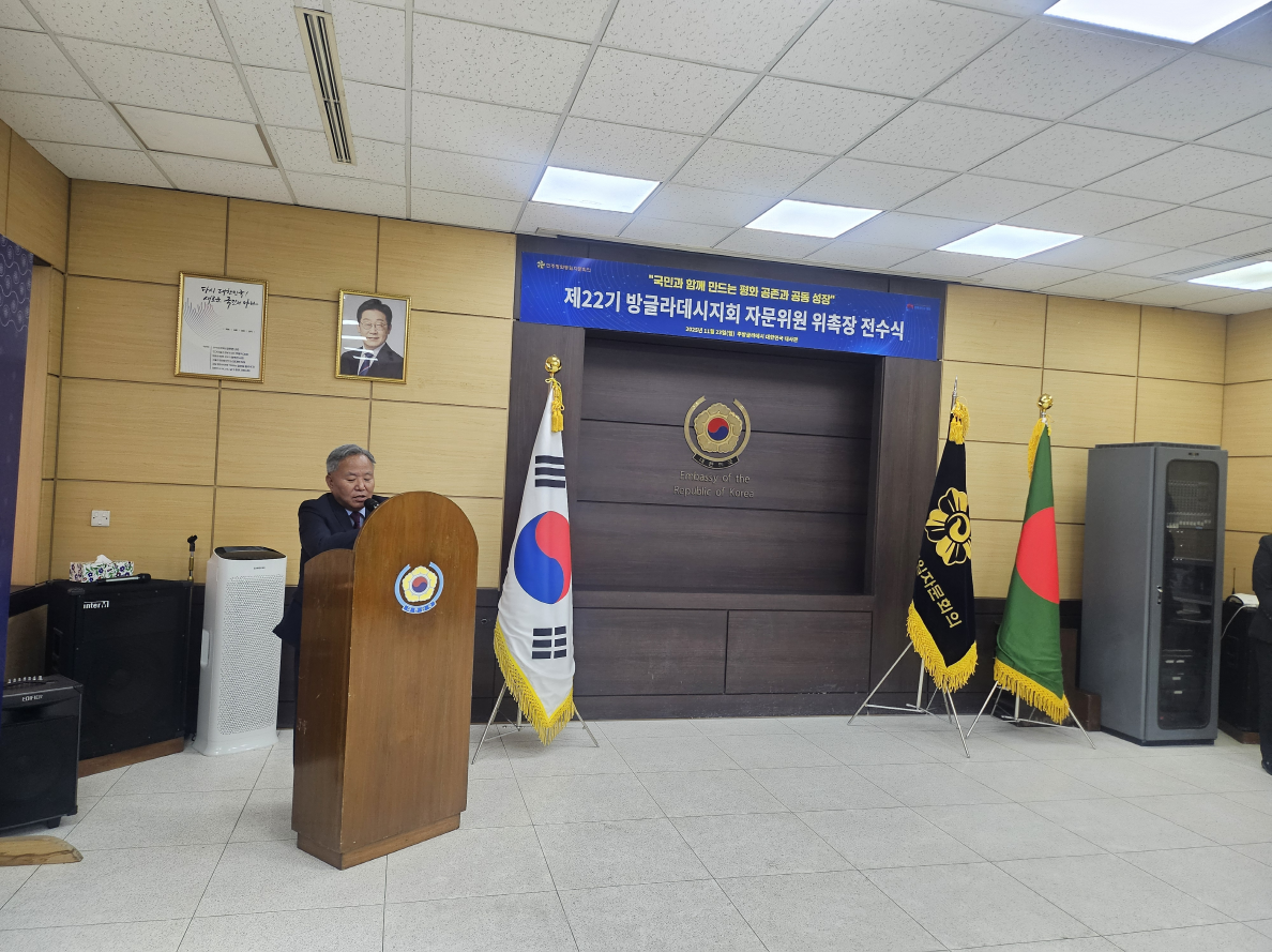 On 23 Nov. Embassy of the Republic of Korea held a ceremony to appoint an advisor to the Bangladesh branch of the South West Asia Council of the Peaceful Unification Advisory Council. Ambassador Park Youngsik delivered a letter of appointment to the members, urging active activities such as spreading consensus on peaceful unification in the Korean community and country of residence also.