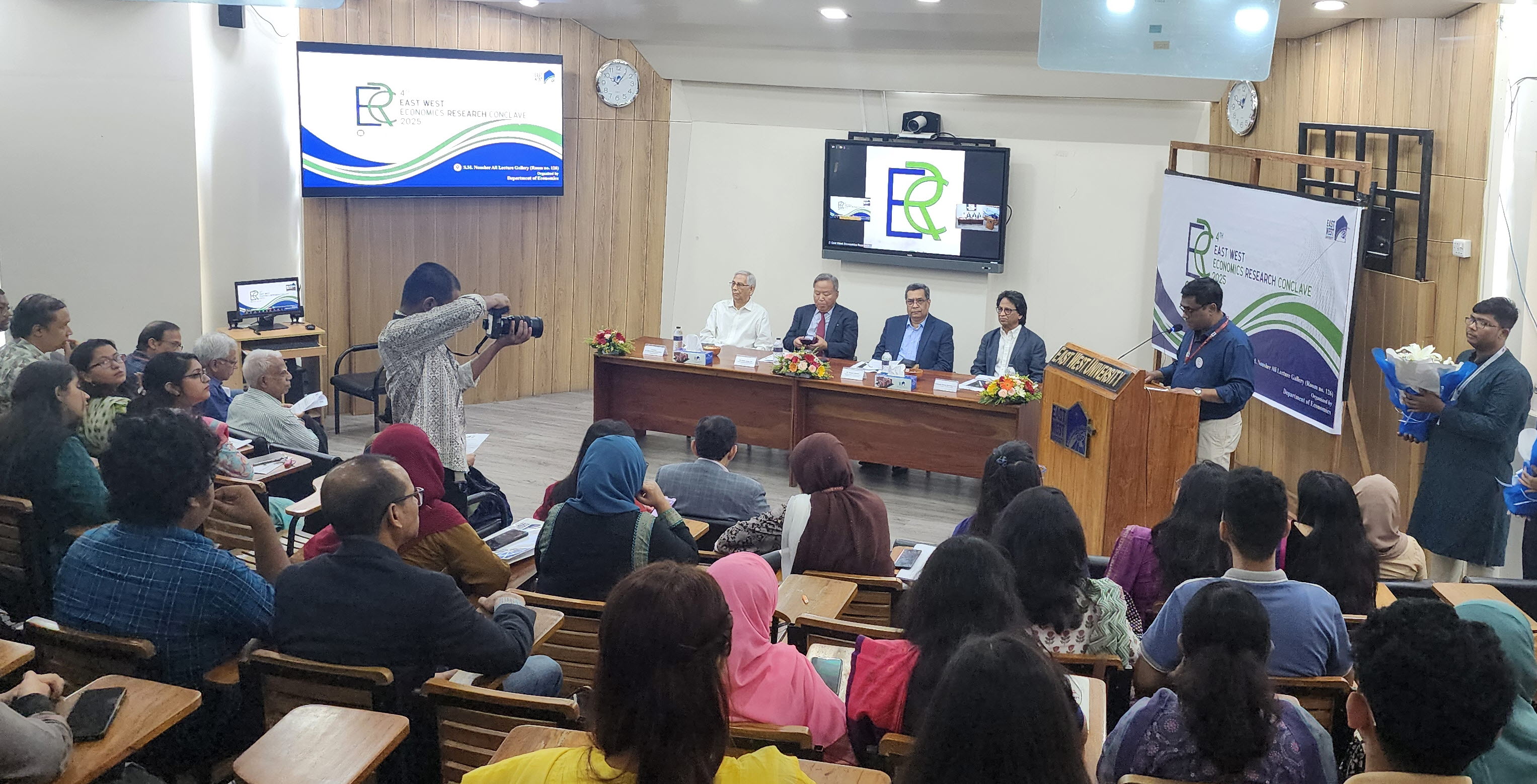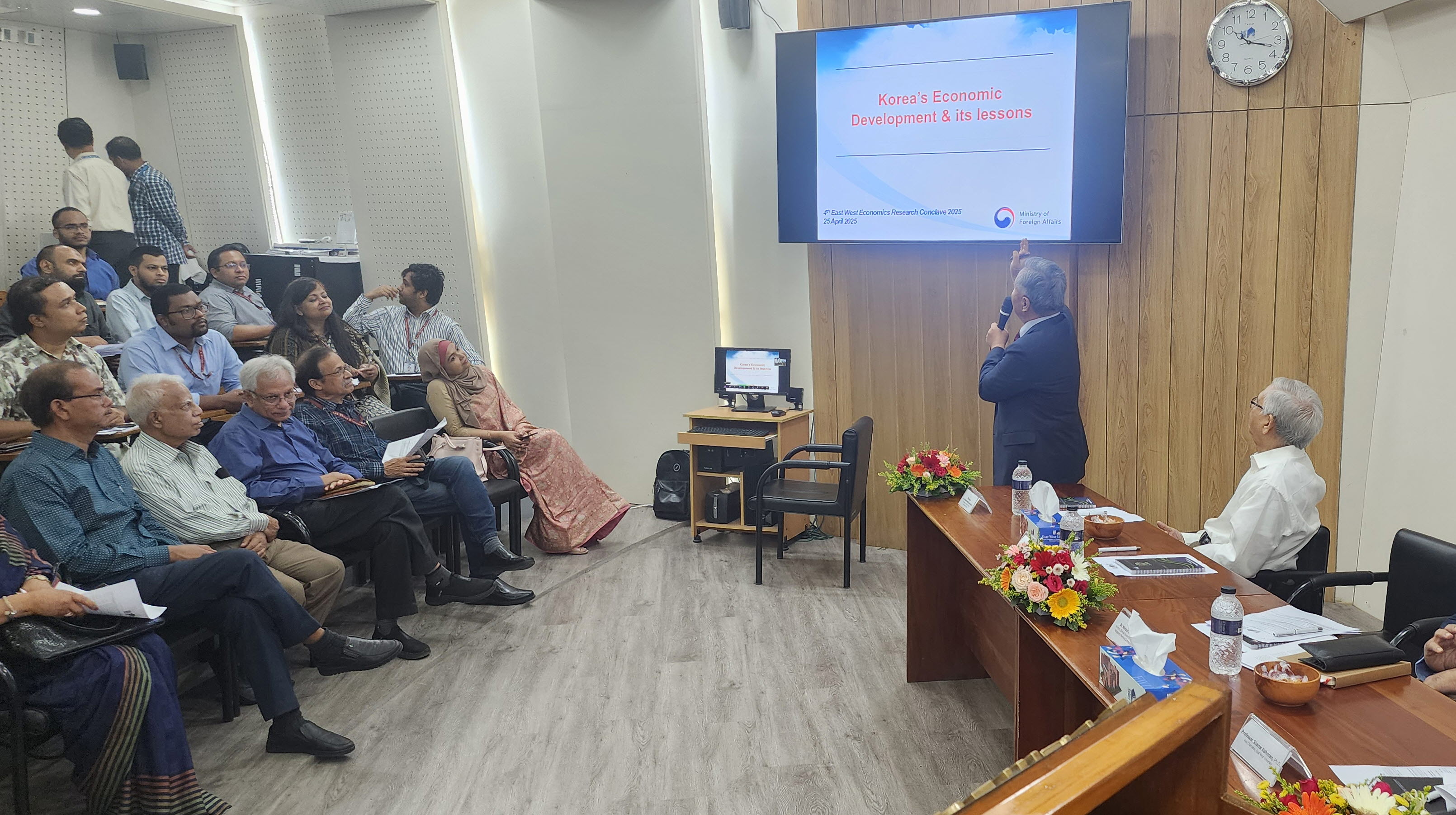 박영식 대사는 4.25. 방글라데시 동서대학교(East West University)가 주관하는 경제학회(4th Economics Research Conclave)에 참석하였습니다. 박대사는 이 자리에 참석한 주재국 교수, 경제 관료 및 학생들을 상대로 우리 경제 발전에 대한 소개 및 방글라데시 경제 발전 방향을 주제로 기조 연설을 하였습니다.