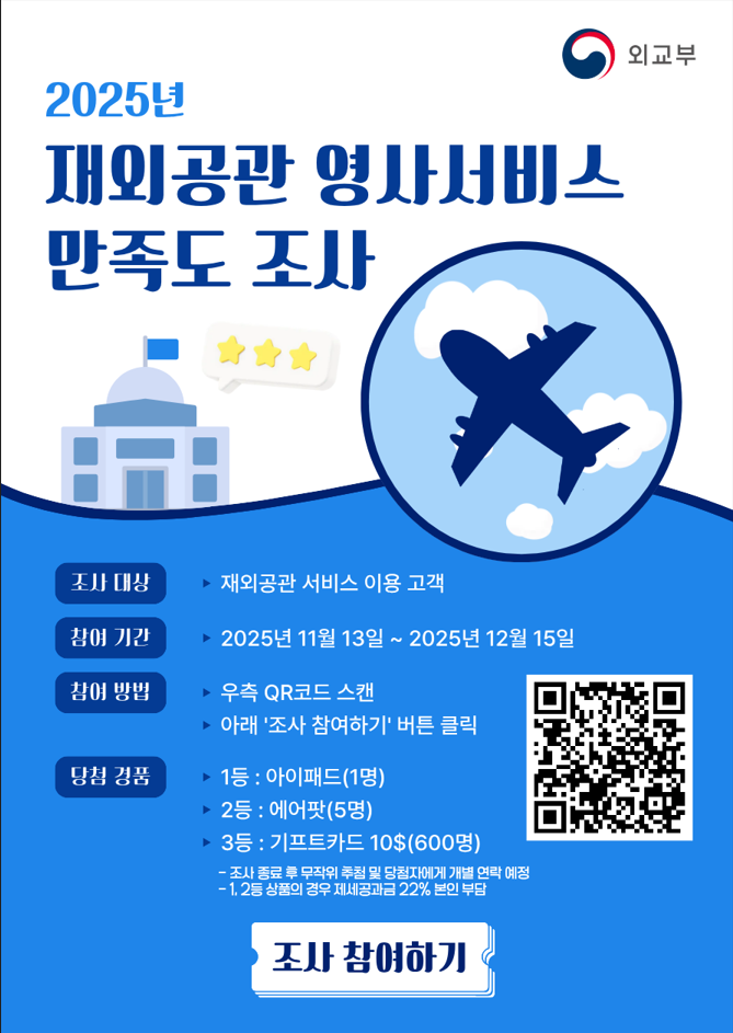 영사서비스 만족도 설문 조사 참여 바로가기 사이트 : https://kon.kric.com/project/2510032_A/INDEX.asp