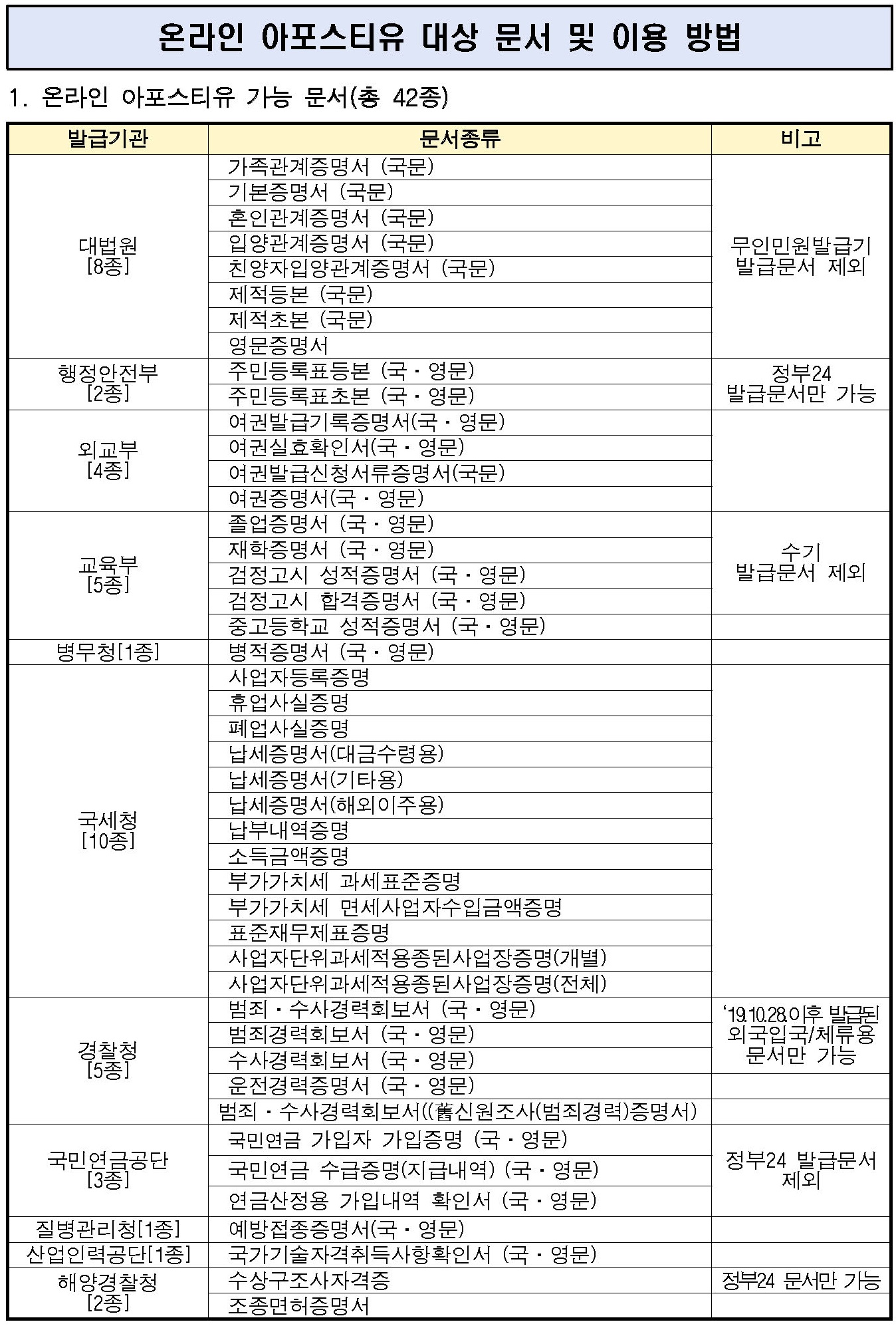 재외동포서비스지원센터는 대한민국 공문서 42종의 아포스티유를 구내외 어디서나 인터넷으로 발급할 수 있는 온라인 서비스를 무료로 제공하고 있습니다.