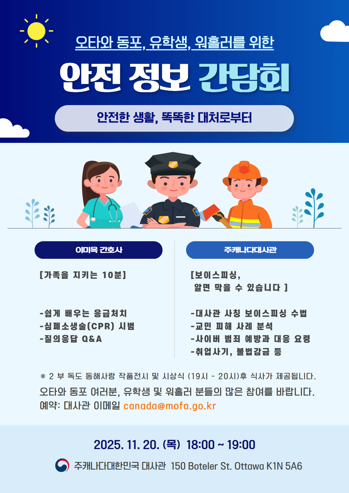 주캐나다대사관은 오타와 동포,유학생,워홀러를 위한 안전 정보 간담회를 다음과 같이 개최합니다. 많은 분들의 관심과 참여를 부탁드립니다. 예약 및 문의 : canada@mofa.go.kr