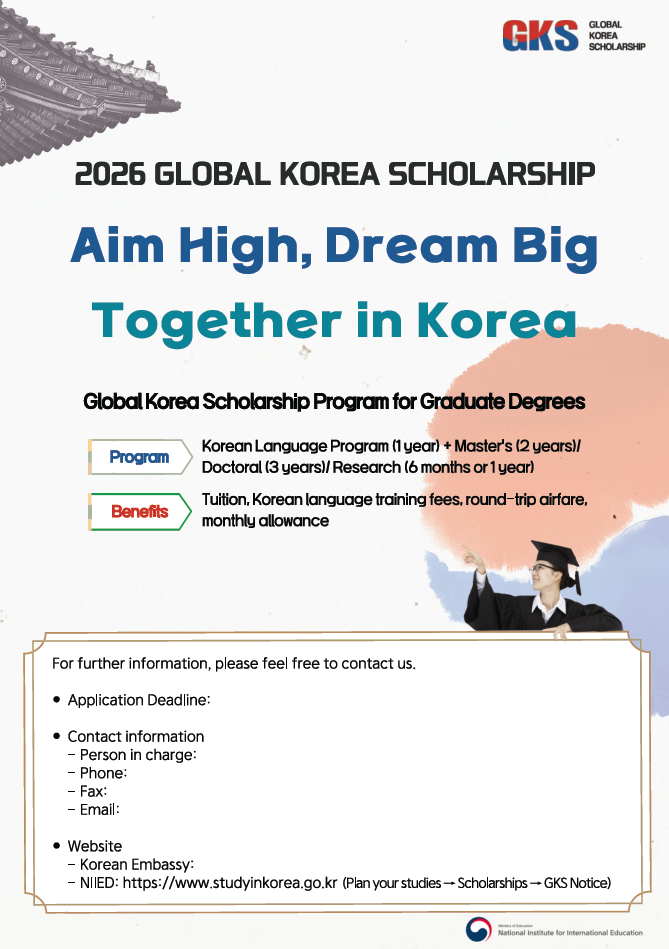 교육부 소속기관인 <국립국제교육원>은 해외 우수인재 양성 및 국가 간 교류협력 강화를 위해 대한민국 정부초청 외국인 장학생 선발 사업을 운영하고 있습니다. 이와 관련하여 2026년 정부초청외국인 대학원 장학생 선발을 다음과 같이 시행하오니, 첨부된 모집요강을 참조하시어 2026년 2월 25일 (수) 18:00(한국시간 기준)까지 한국유학종합시스템(www.studyinkorea.go.kr)을 통해 온라인으로 지원하여 주시기 바랍니다.