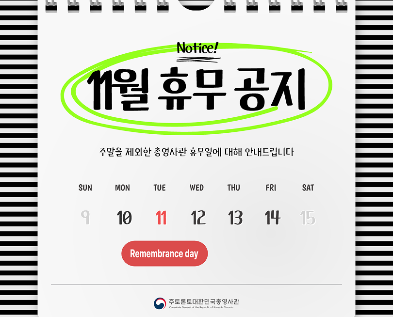 11월 11일(Remembrance day)는 공관 휴무일입니다.