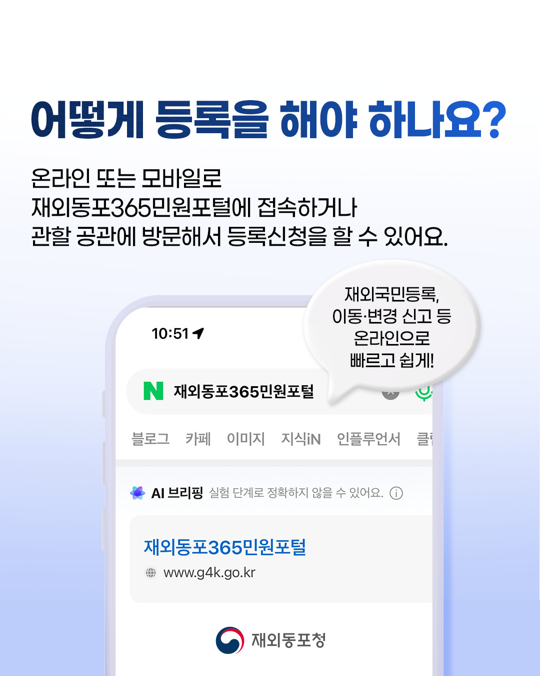 - 온라인 등록(재외동포 365 민원포털 www.g4k.go.kr)