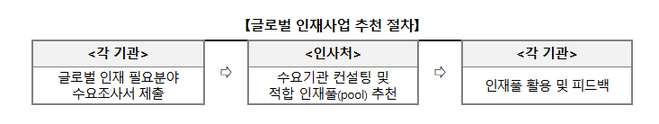 인사혁신처에서는 행정환경의 세계화·전문화로 글로벌 시각과 전문적 식견을 보유한 해외인재의 공직 내 활용 필요성이 증가함에 따라 글로벌 한인인재를 발굴·관리 하는 '글로벌 인재사업' 을 운영하고 있습니다.