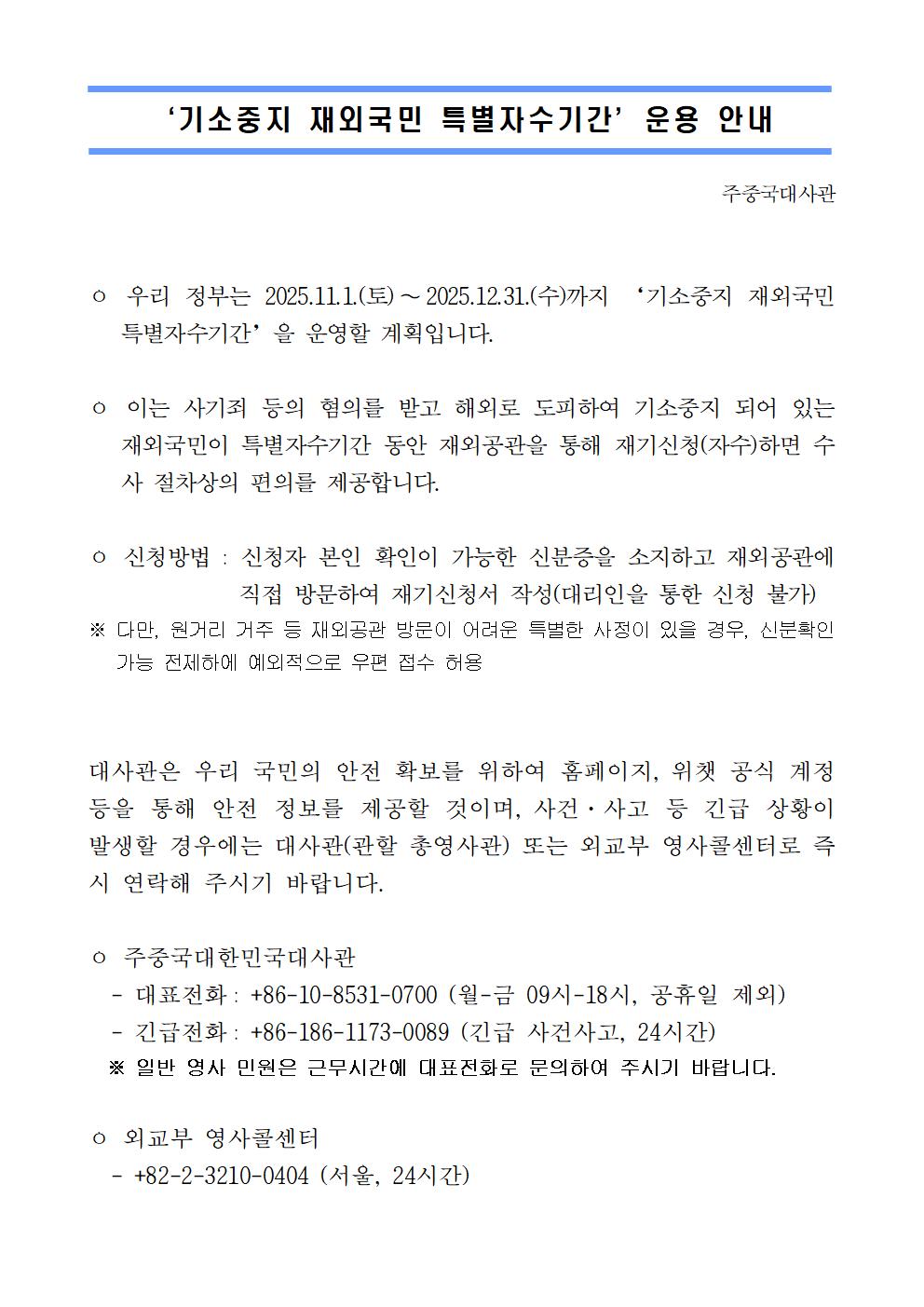 ‘기소중지 재외국민 특별자수기간’ 운용 안내