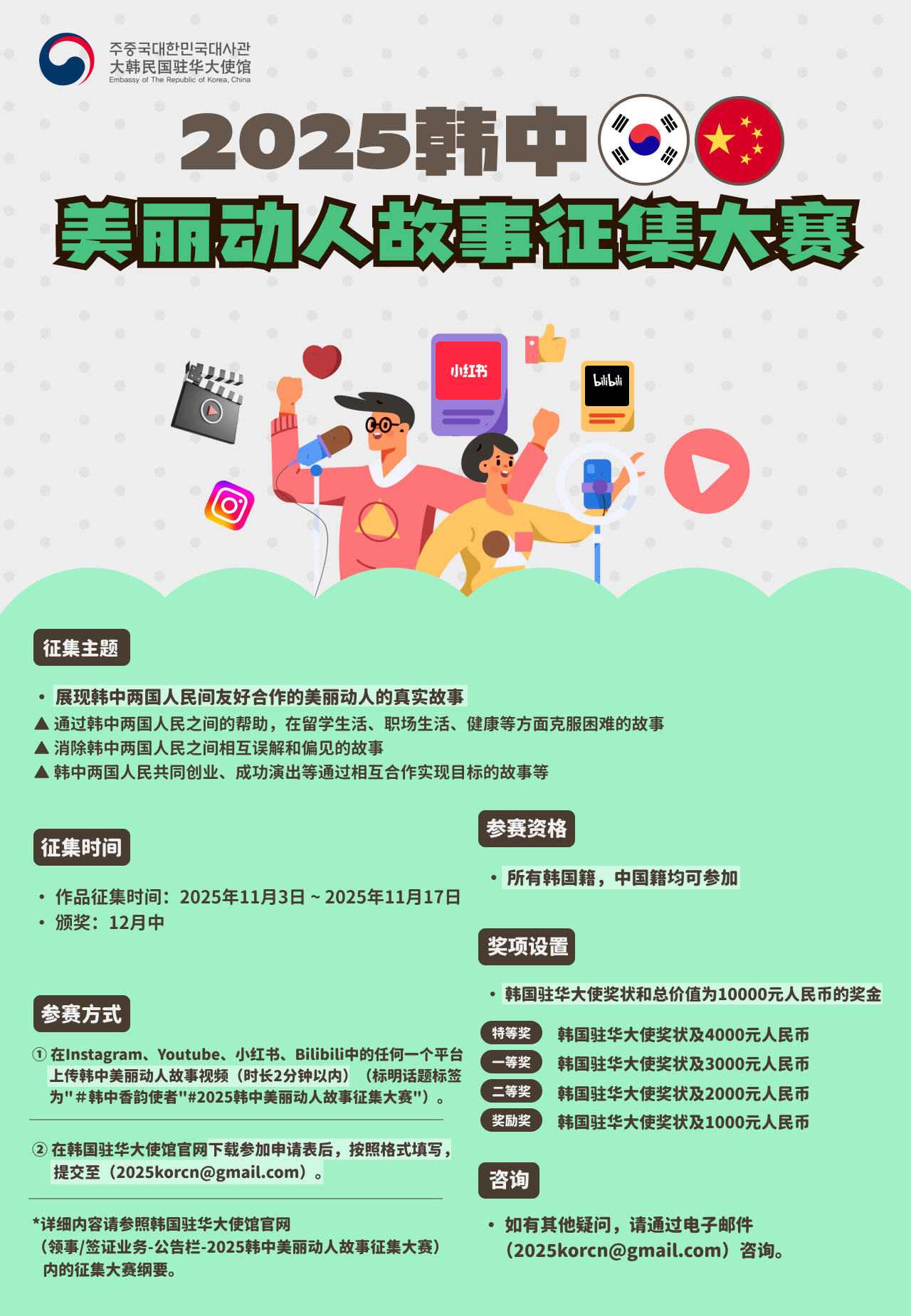 大韩民国驻华大使馆主办的『2025 韩中美丽动人故事征集大赛』正式开始啦!想跟大家分享值得称赞或美丽动人的故事吗? 想参赛的朋友们把故事制作成视频之后,和参赛申请表一起提交就可以啦!欢迎大家踊跃参与!