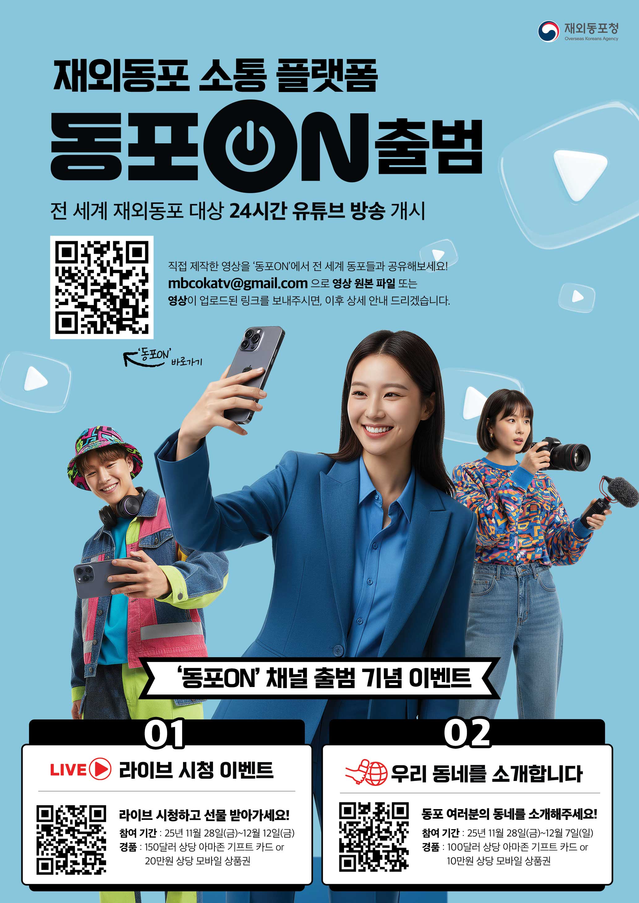 재외동포청은 전 세계 700만 재외동포와의 소통을 강화하기 위해 11월 28일(금) 재외동포 소통 플랫폼 '동포ON'을 공식 출범하고 유튜브 기반 24시간 콘텐츠 송출을 시작하였습니다.