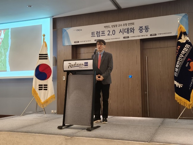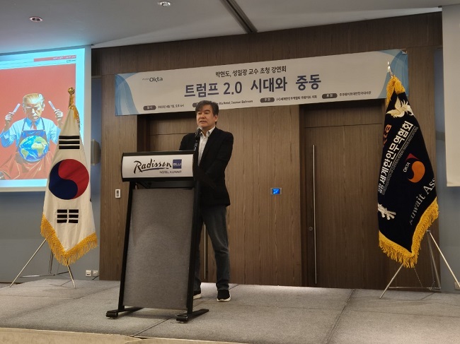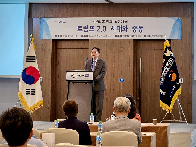 박종석 주쿠웨이트 대사는 4.7.(월) 세계한인무역협회(World-OKTA) 쿠웨이트지회 주최 중동 전문가 초청 강연회에 참석하여 축사를 하였습니다. 앞서 4.6.(일)에는 대사관저에서 강연자(박현도, 성일광 교수) 및 관계자들을 초청하여 만찬을 개최하였습니다.