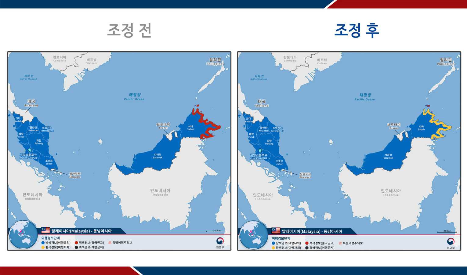 우리 대사관은 외교부에서 2025.7.1.(화)자로 말레이시아 사바주 동부 해안 지역을 3단계에서 2단계로 하향조정 하였음을 안내드립니다.
