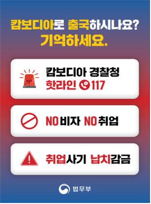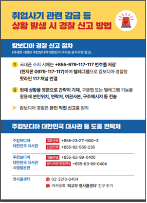 캄보디아 내에서 한국인 대상 취업사기 피해사례가 급증함에 따라, 우리 외교부는 10. 10.(금)부로 수도 프놈펜 등에 '특별여행주의보' 또는 '여행금지'를 발령(링크)하였으며,우리 교민분들은 아래의 조치사항을 숙지하시어 안전에 유의하시기 바랍니다.