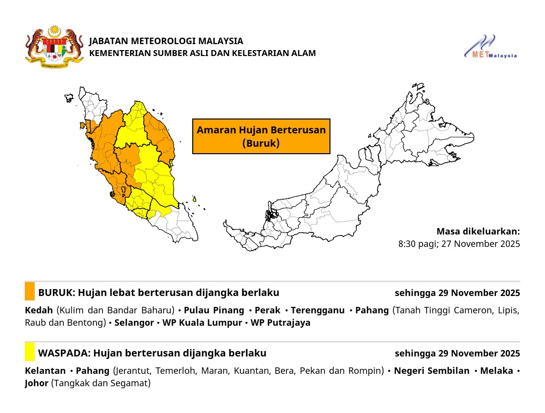 이로 인해 2025년 11월 27일부터 29일까지 말레이시아 반도, 특히 서부와 중부 지역에서 지속적인 폭우, 강풍, 높은 파도가 발생할 가능성이 있으며, 말레시이사 기상청(MET Malaysia)은 열대폭풍 경보, 지속적 강우 경보, 강풍 및 높은 파도 경보를 발령하였습니다.