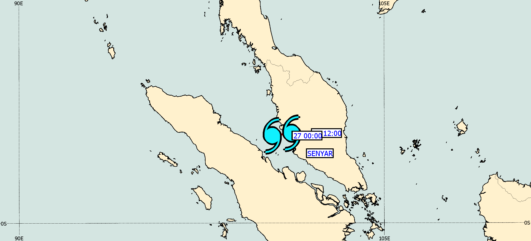 말레이시아 기상청에 따르면, 열대폭풍 (세냐르, Senyar)가 북부 수마트라 3.6°N, 99.9°E 지점과 페락 주 Lumut 지역에서 남서쪽으로 102km 떨어진 위치에서 탐지되었으며, 현재 동남동 방향으로 이동하여 말라카 해협 해역으로 진입, 말레이시아 반도 서쪽으로 향하고 있는 것으로 확인되었습니다.