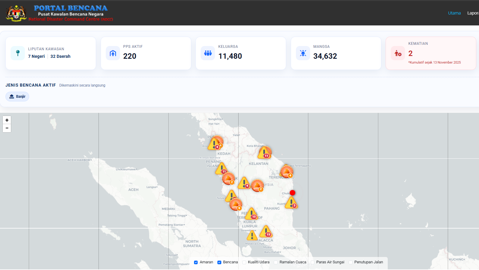 『말레이시아 국가재난통제센터(NDCC) 실시간 집중호우·홍수피해 상황』