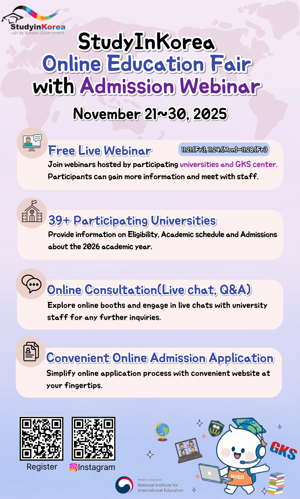 The National Institute for International Education (NIIED) will host the “2025 Study-in-Korea Webinar Admissions Fair” to expand and diversify the recruitment of outstanding international students.