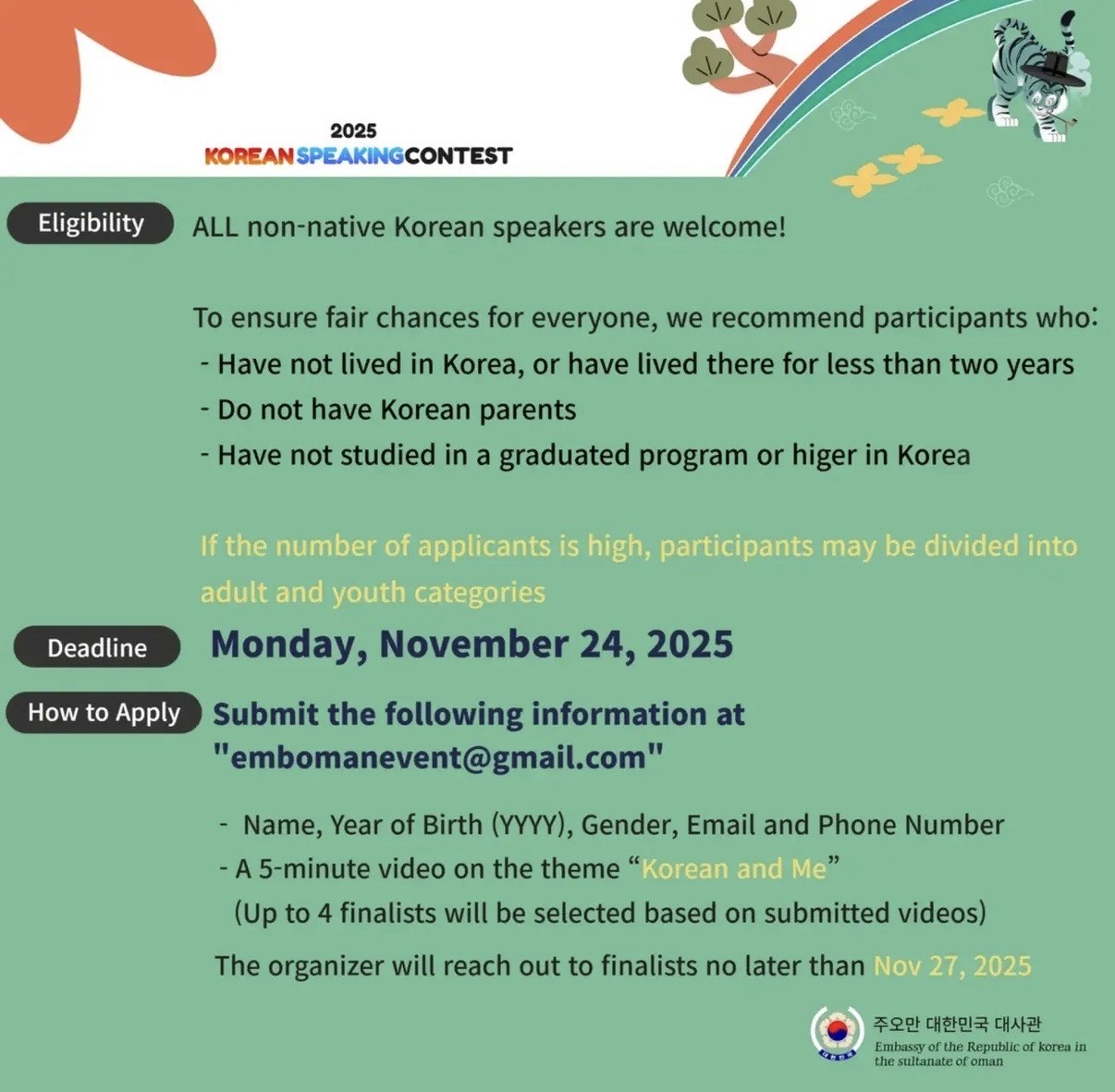 The Embassy of the Republic of Korea in Oman is pleased to announce the upcoming Korean Speaking Contest, which will be held on Thursday, December 4 at 5:30 PM.