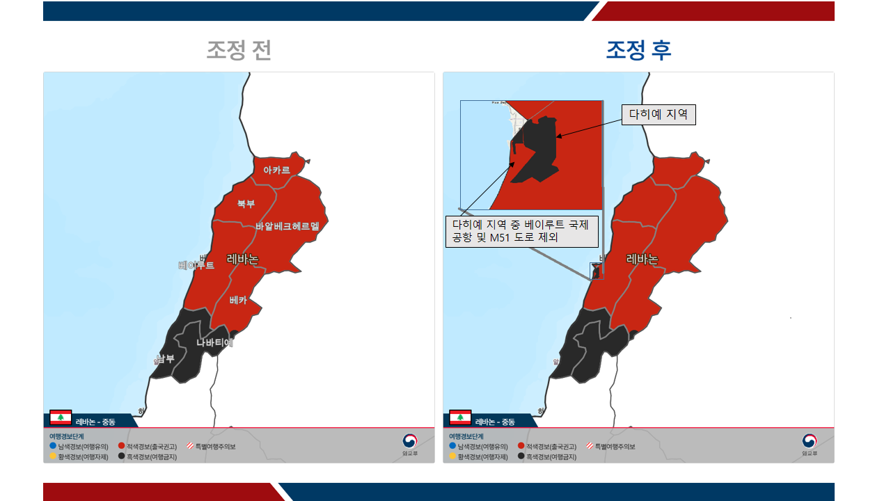 -4단계(여행금지): 남부 이스라엘 접경 지역(블루라인으로부터 5km 포함), 남부주, 나바티예주, 다히예의 일부 지역(베이루트 공항, M51도로 제외)