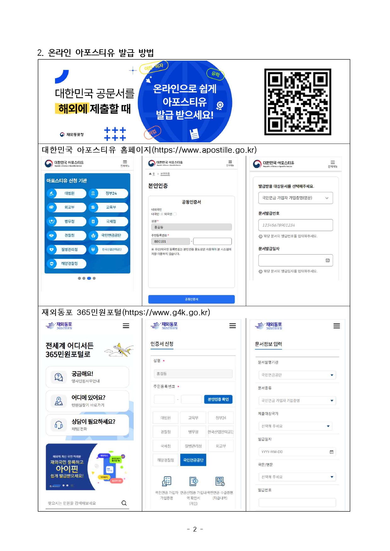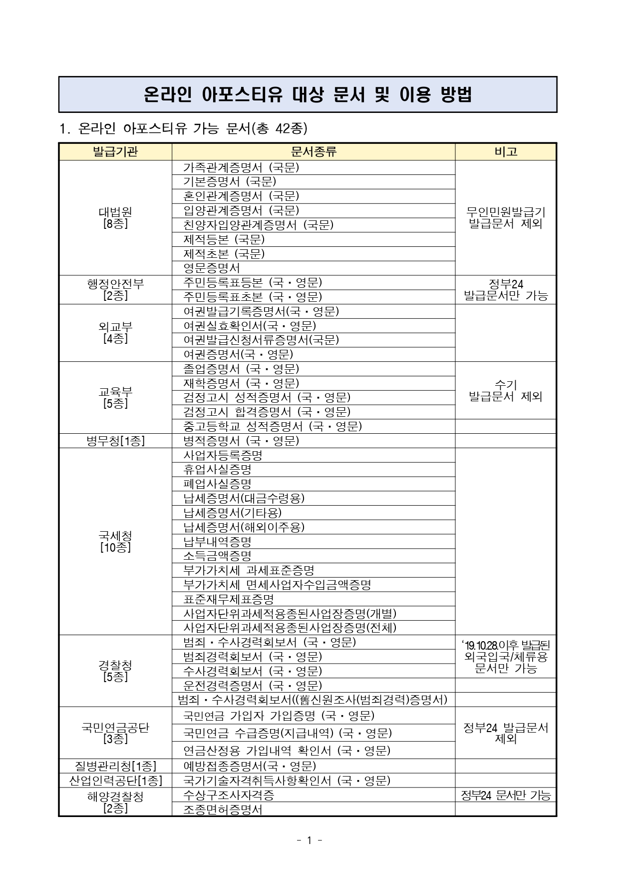 위와 관련, 온라인 아포스티유 대상문서(42종) 및 이용방법 안내드리오니 많은 이용 바랍니다.