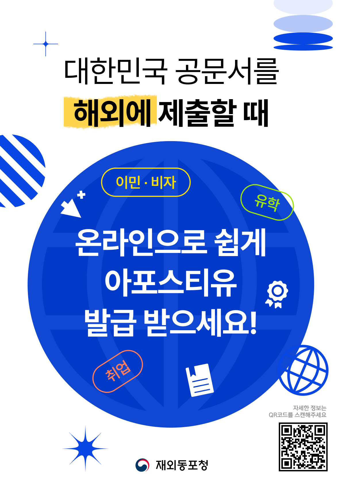 재외동포청(재외동포서비스지원센터)은 대한민국 공문서 42종의 아포시티유(를 국내외 어디서나 인터넷으로 발급할 수 있는 온라인 서비스를 무료로 제공하고 있습니다.