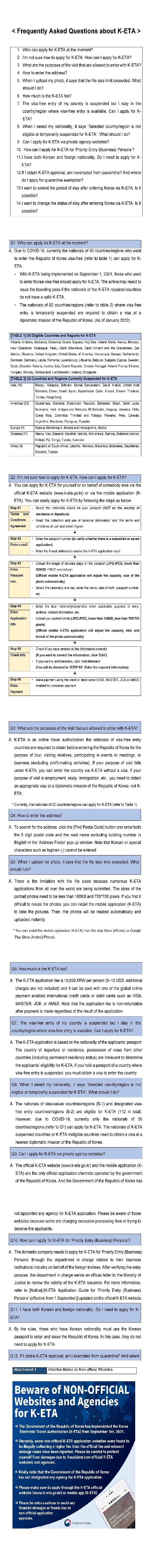 - Nationals or citizens of K-ETA eligible countries should apply for K-ETA through the K-ETA website(www.k-eta.go.kr) or the mobile app(K-ETA) at least 24 hours before departure.