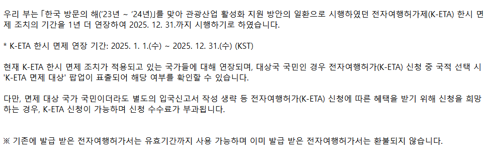 대한민국 전자여행허가제(K-ETA) 한시 면제 기간 연장 알림