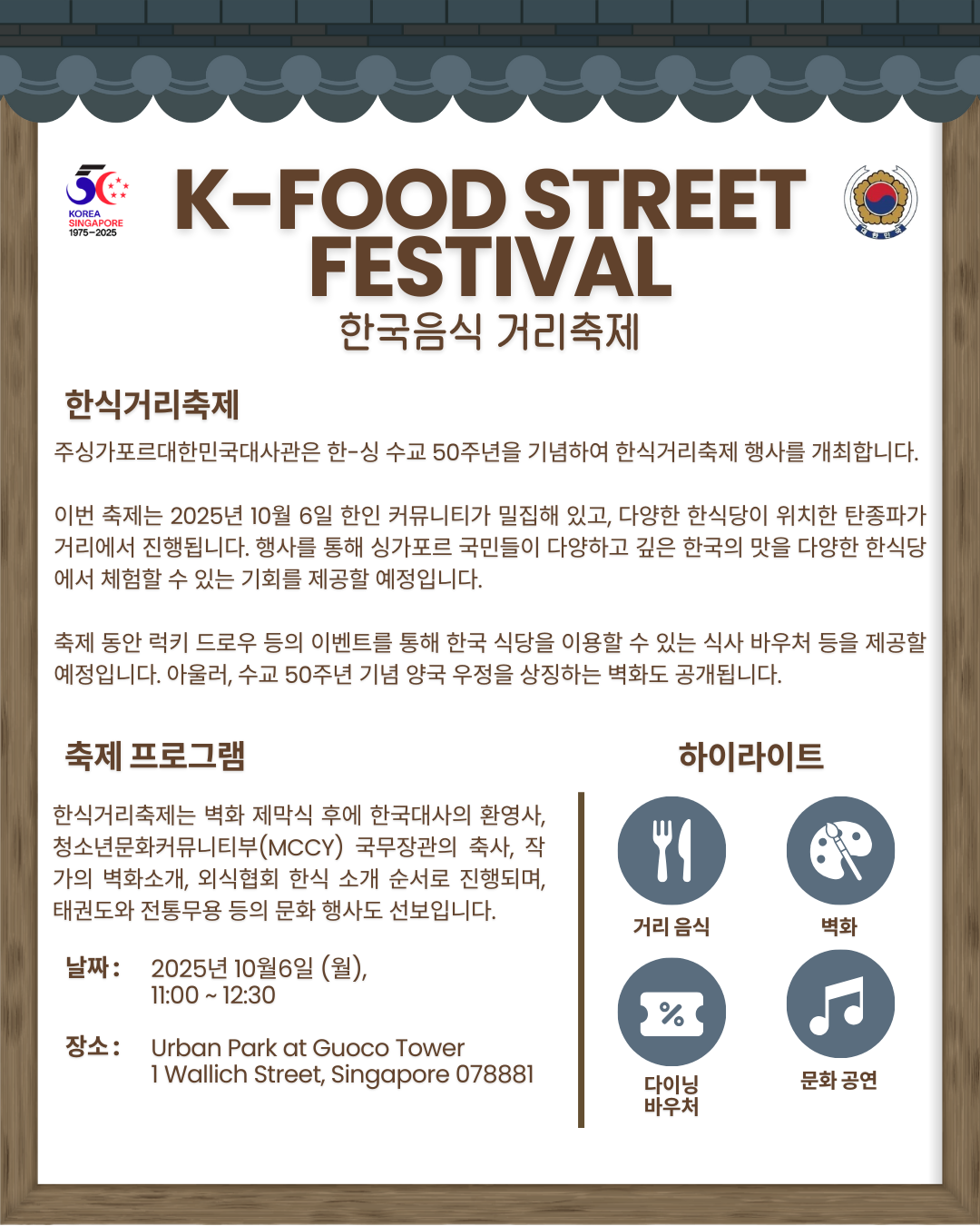 한국과 싱가포르 수교 50주년을 기념하여 K-Food Street Festival 개최 소식을 알려드립니다.
