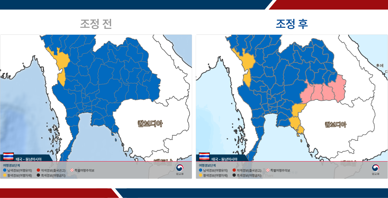 우리 외교부는 7.25.(금) 한국시간 12시(태국시간 25일 오전 10시)부로 해당 지역의 여행경보를 상향 조정하니 동 지역 방문을 자제하고, 태국 정부의 대피 관련 안내에 따라 주시기 바랍니다.