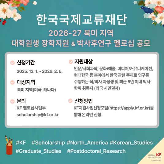 2026년도 한국국제교류재단(KF) 북미 지역 대학원생 장학지원 및 박사후연구 펠로십 공모