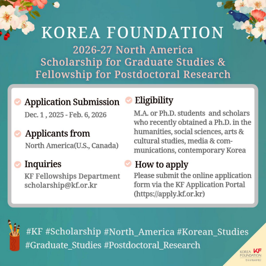 한국국제교류재단은 한국 전문가 육성 사업의 일환으로 대학원생 장학지원 및 박사후연구 펠로십 사업을 시행하고 있습니다. 북미 지역 우수한 석·박사생들 및 선진 학자들의 많은 관심과 참여를 바랍니다.