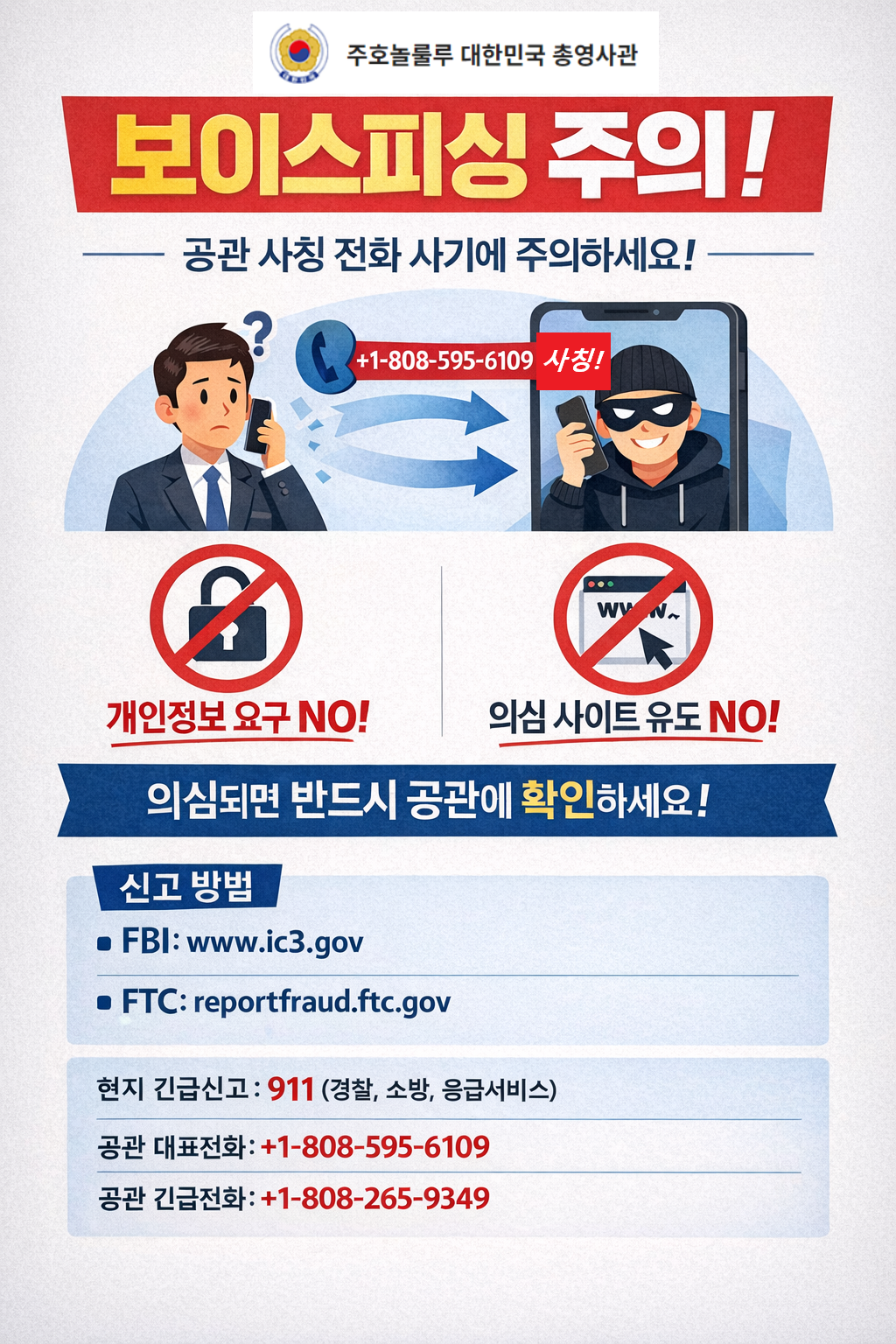 주호놀룰루총영사관 발신번호 도용 전화 사기 주의