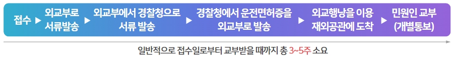 ○ 해외에 체류 중인 우리 국민의 편의를 위해, 재외공관에서 경찰청(도로교통공단)의 업무를 위임받아 대한민국 운전면허증의 갱신과 재발급을 접수해주고, 이후 이를 교부해주는 서비스. *실제 면허증의 심사와 발급은 경찰청(도로교통공단)에서 진행