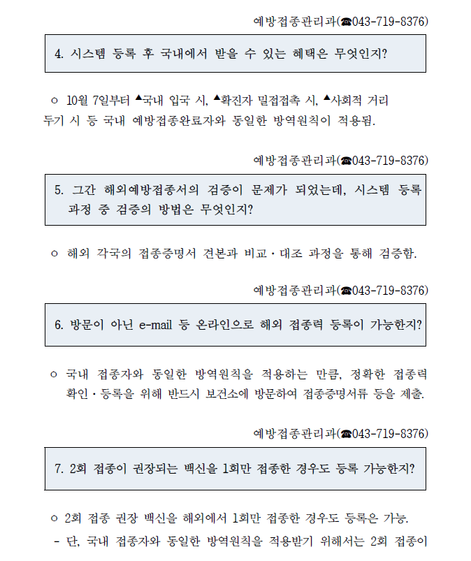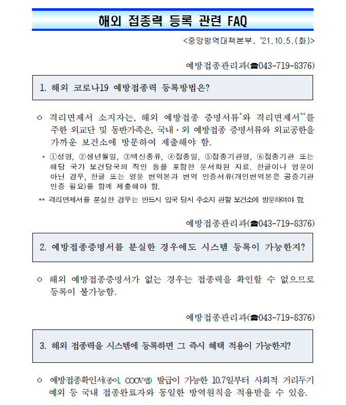 중앙방역대책본부는 2021.10.7.(목)부터 해외 예방접종완료자의 코로나19 백신접종이력을 한국내 예방접종시스템에 등록하고 확인서를 발급할 예정임을 알려온바, 관련 궁금하신 사항은 각 지역 보건소로 문의하여 주시기 바랍니다.