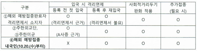 ④ 격리면제서가 없는 해외 예방접종완료 내국인(한국 국적자) : 2021.10.20.(수)부터 시행