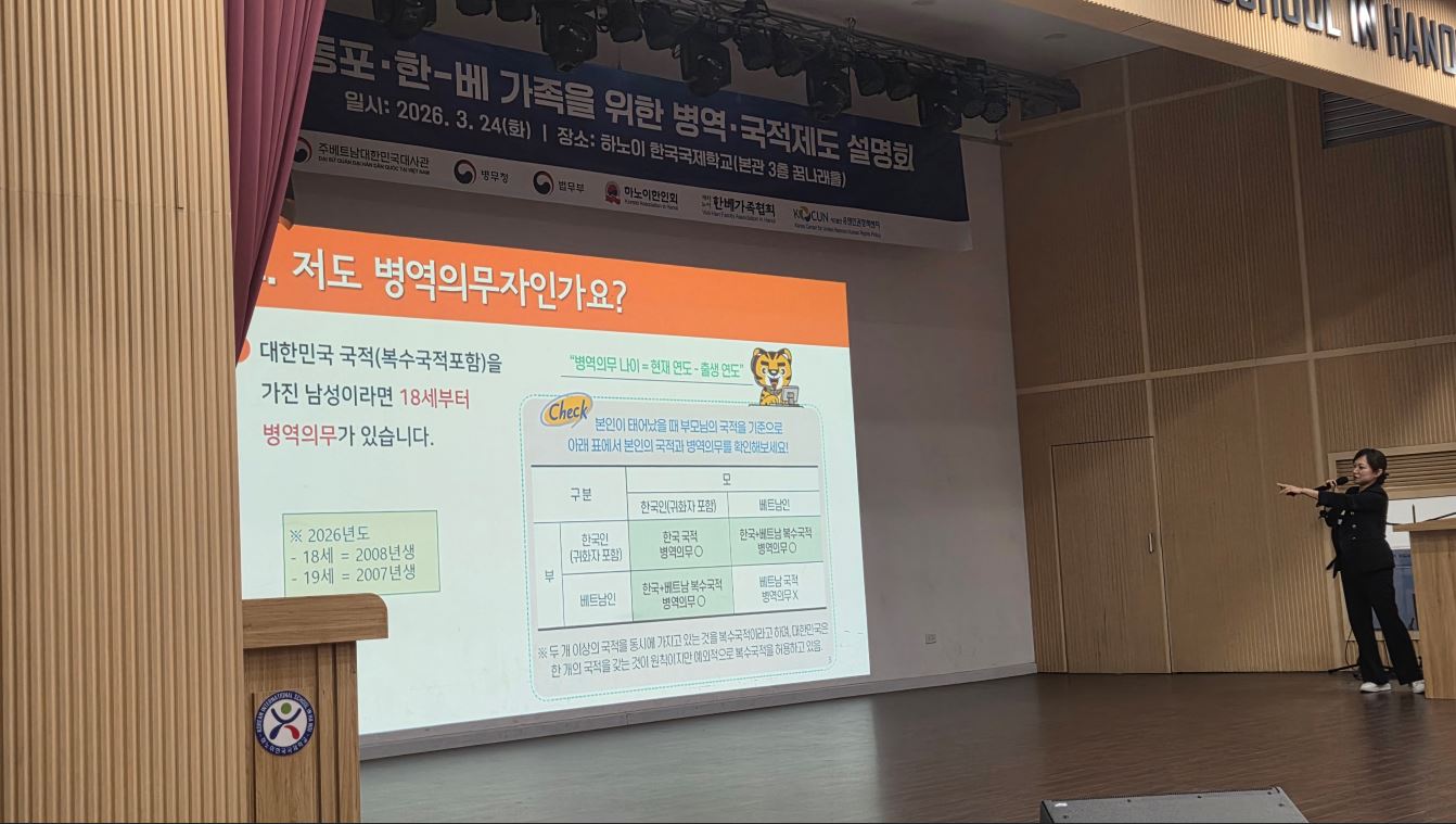 3월 24일(화), 주베트남대한민국대사관은 병무청, 법무부와 함께 병역국적제도 합동설명회를 하노이이한국국제학교(KISH)에서 개최하였습니다.