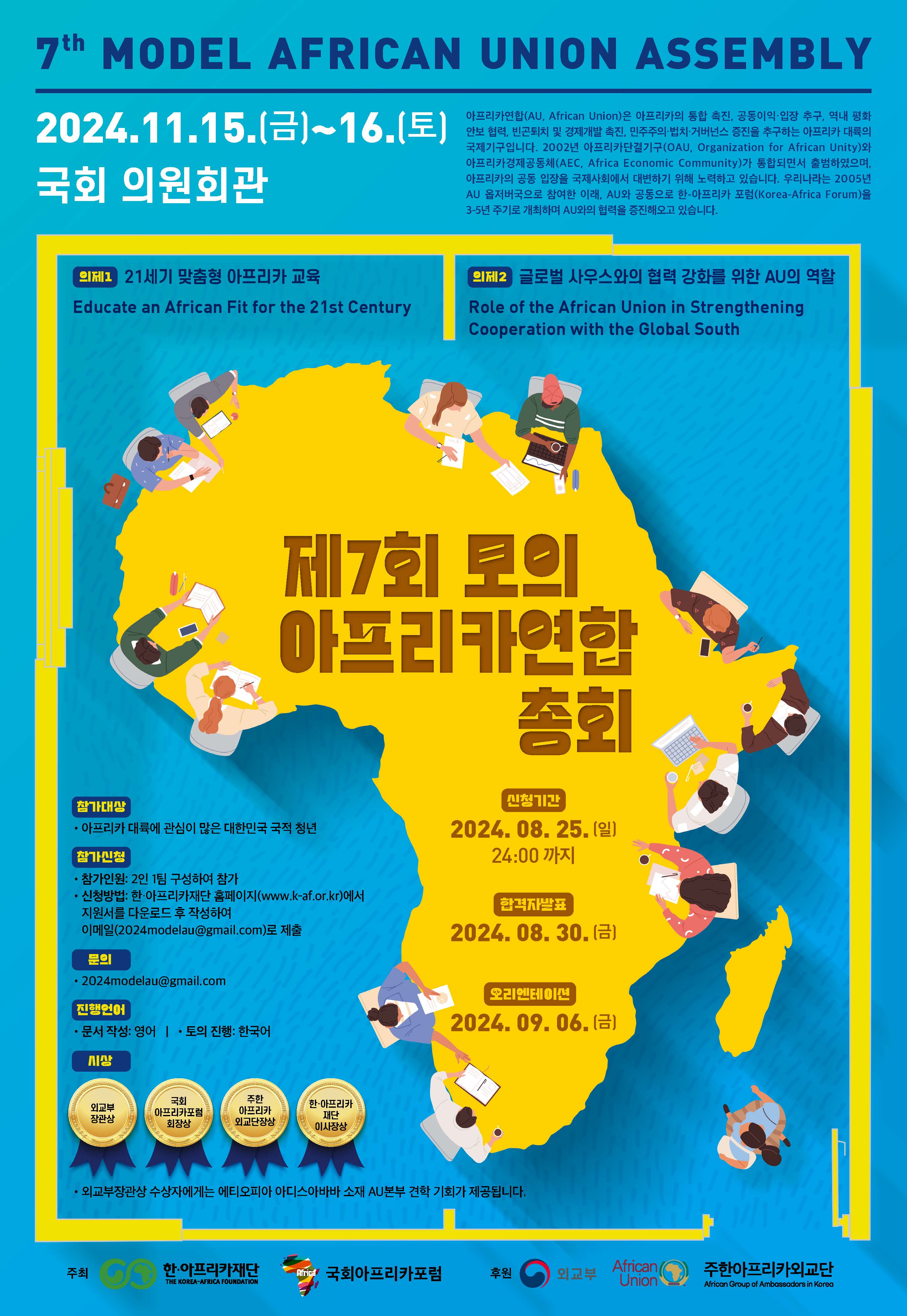 한·아프리카재단은 AU의 역할을 소개하고 의제별 결정안 채택 등 정부 간 국제회의 진행방식으로 아프리카 대륙의 주요 현안을 논의하는「제7회 모의 아프리카연합(AU) 총회」를 개최합니다. 아프리카 대륙에 관심과 열정을 지닌 청년들의 많은 참여를 바랍니다.