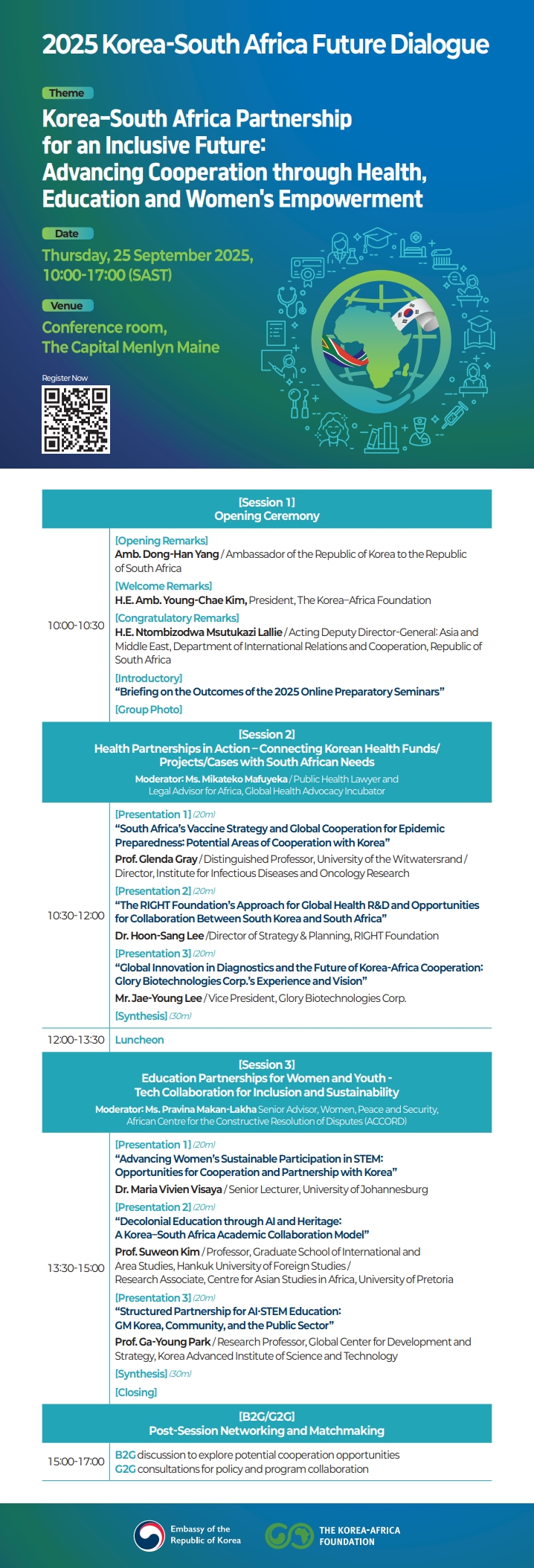 주남아공한국대사관은 한아프리카재단과 공동으로 2025.9.25(목) "2025 한-남아공 미래대화"를 개최합니다.